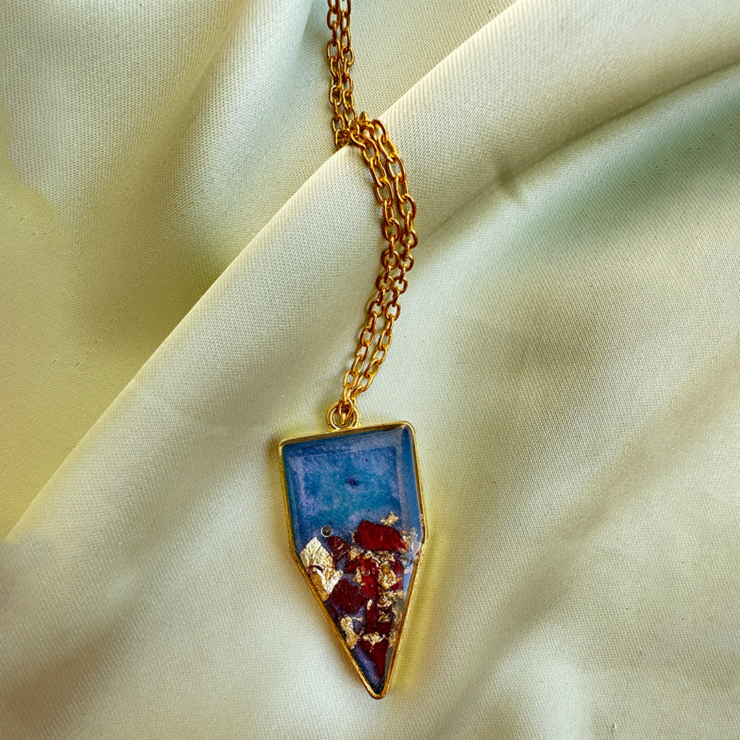 A stylish and versatile jewelry piece made from epoxy or UV resin, often incorporating elements like dried flowers, glitter, gold flakes, or gemstones for a unique look. These pendants can be transparent, colorful, or even feature artistic designs, making them a trendy choice for both casual and formal wear.